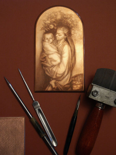 О технике меццо-тинтоМеццо-тинто, черная манера (Mezzotint, Schabkunst, Maniere noire) – техника гравирования на меди, при которой изображение создается с помощью пятен различной тоновой насыщенности, от глубоко черного до жемчужно-серебристого, почти белого.Для гравирования способом меццо-тинто поверхность медной доски делается шероховатой с помощью специального инструмента - гранильника, или качалки. Этот процесс «зазернения» в традиционной меццо-тинто очень трудоемкий и выполняется вручную. Пластина должна быть пройдена гранильником в 24 – 50 направлениях для создания качественного зерна, что требует многодневной, напряженной работы. При печатании с такой пластины получается равномерный бархатистый черный тон. Затем на доску особым способом переводится рисунок. На подготовленной таким образом доске начинают работать остро отточенной гладилкой или шабером от черного к белому тону, постепенно сглаживая или выскребая шероховатую поверхность. Самые светлые места полируют. Итак, художник работает здесь не штрихом (как в офорте или резцовой гравюре), а тоновыми пятнами. Снятые с досок оттиски отличает особый мягкий и глубокий бархатистый тон. С пластин меццо-тинто можно получить не более 40 - 60 хороших оттисков, так как во время печатания шероховатая поверхность в темных местах постепенно стирается. Техника меццо-тинто была изобретена около 1642 года работавшим в Амстердаме уроженцем Германии Людвигом Ван Зингеном. Художник - любитель принц Рупрехт Пфальцский перенес новую технику в Англию. С середины XVIII века черная манера получила здесь блестящее развитие, став как бы специфически английским видом гравюры. В России эта техника появляется в начале XVIII века. В течение этого столетия русские и приезжие иностранные мастера создают в технике черной манеры свои работы. В XIX веке использование меццо-тинто постепенно прекращается. В настоящее время лишь немногие художники-графики пытаются возродить эту технику. | ||